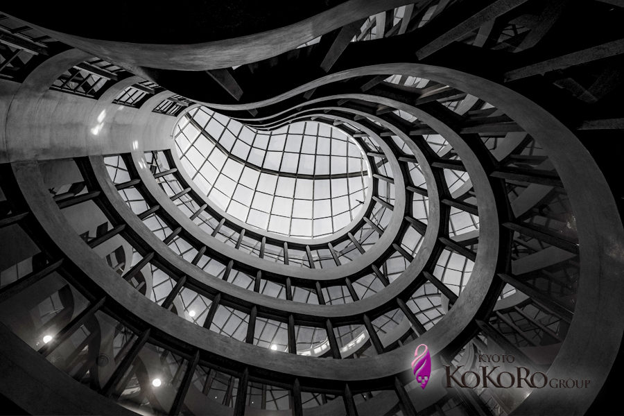 この建築物はガウディではありませんが、吹き抜けのロビーから上を見上げると直線が一つもなく全て優雅な曲線で造形されている。