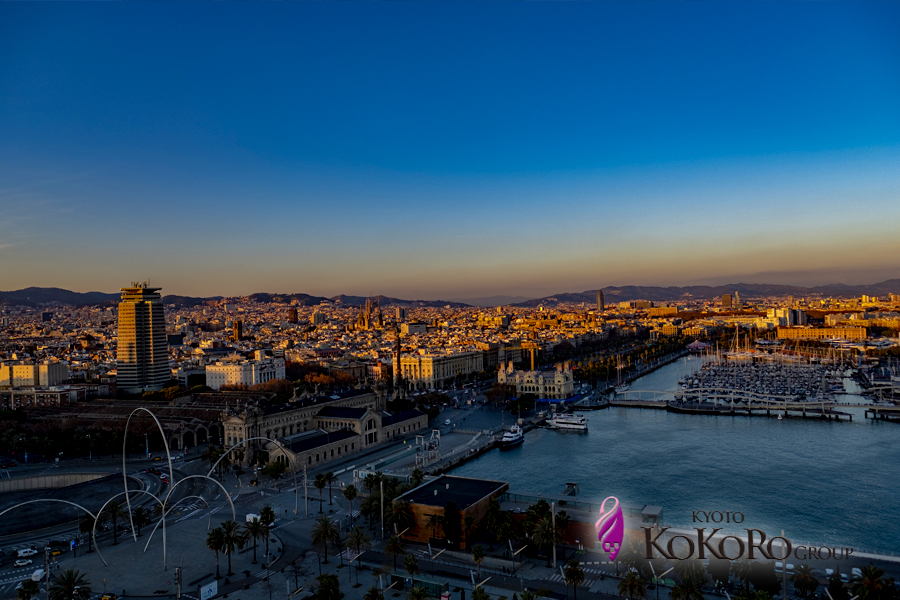 時間的に太陽が少し傾き始めた時でバルセロナ市街がうっすらとオレンジ色に輝き始めた瞬間です。