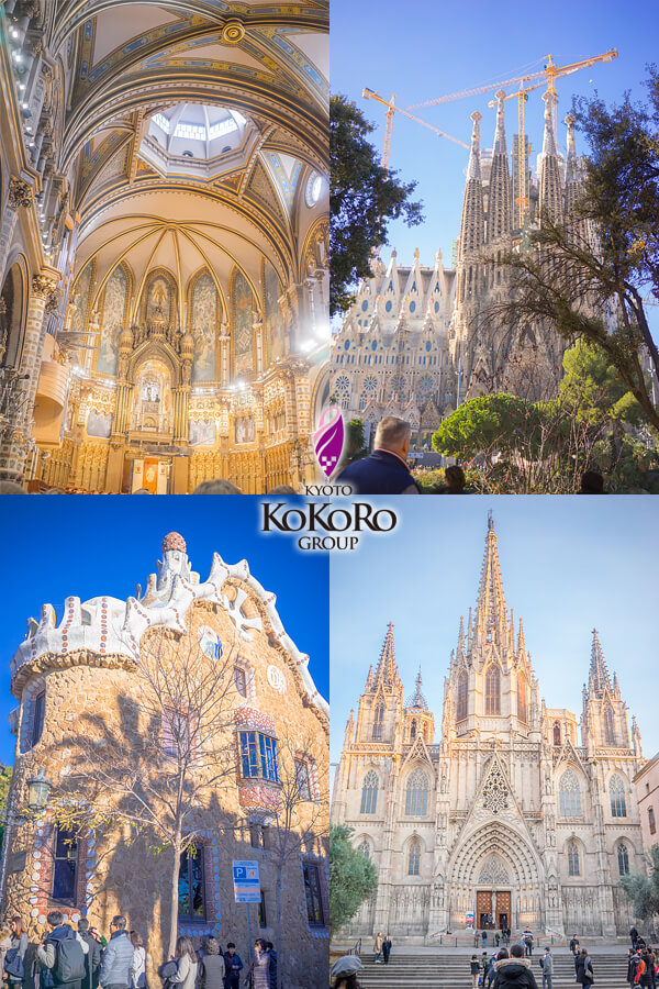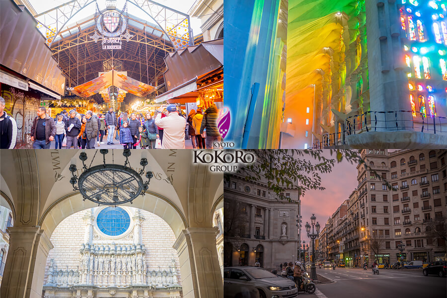 左上から時計周りに、先ほどの市場の入り口と、サグラダファミリアの中のお写真、市街地の夕焼けに包まれた美しい風景、そして、モンセラートのお写真です♪♪