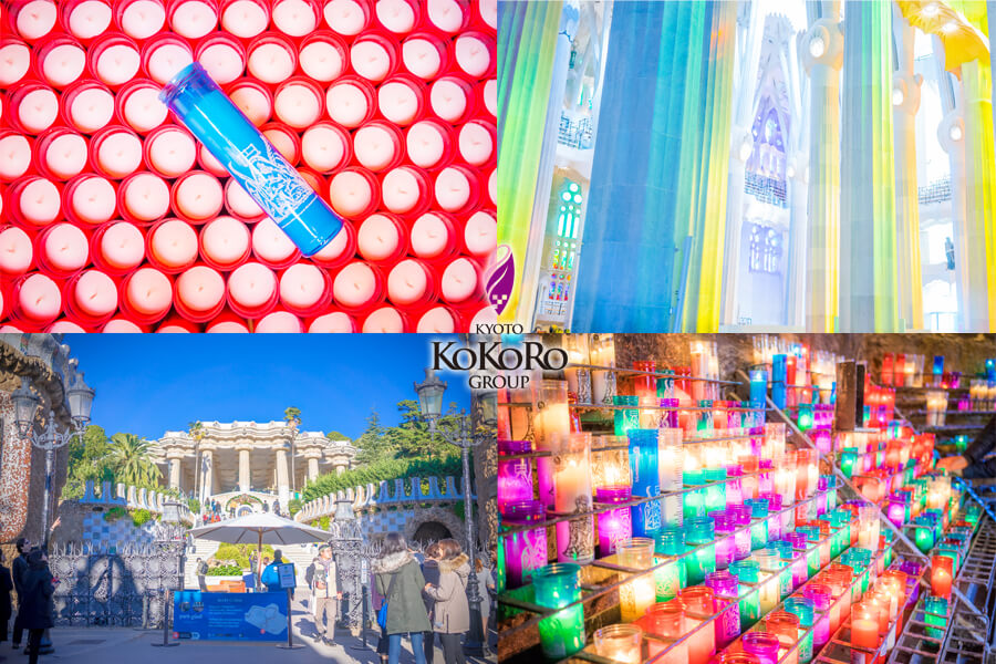 右上の虹色のお写真は、サグラダファミリアの中のお写真♪♪ステンドグラスに照らされて、真っ白の柱や壁が色鮮やかなキャンバスに(*´▽`*)