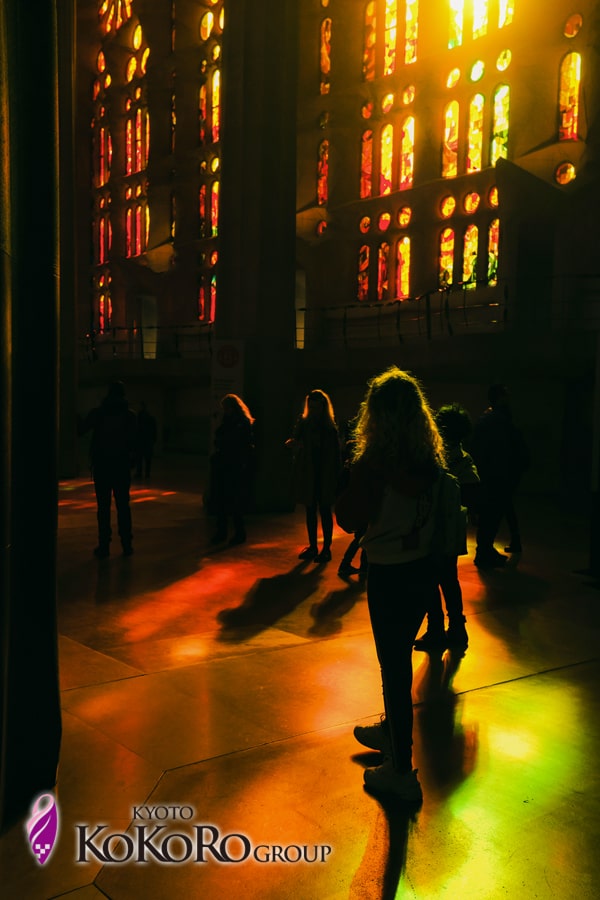 三枚目はそのサグラダファミリアの内部を撮ったものです。お昼ぐらいになると太陽が高くなりステンドグラスを通過した太陽の光が色鮮やかに内部を染めていました。