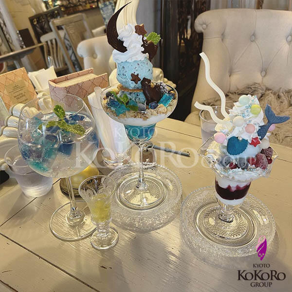 左から、紫陽花ゼリーとモヒートソーダ、チョコミントと魔法のねこパフェ、人魚の島のカラフルパフェです。