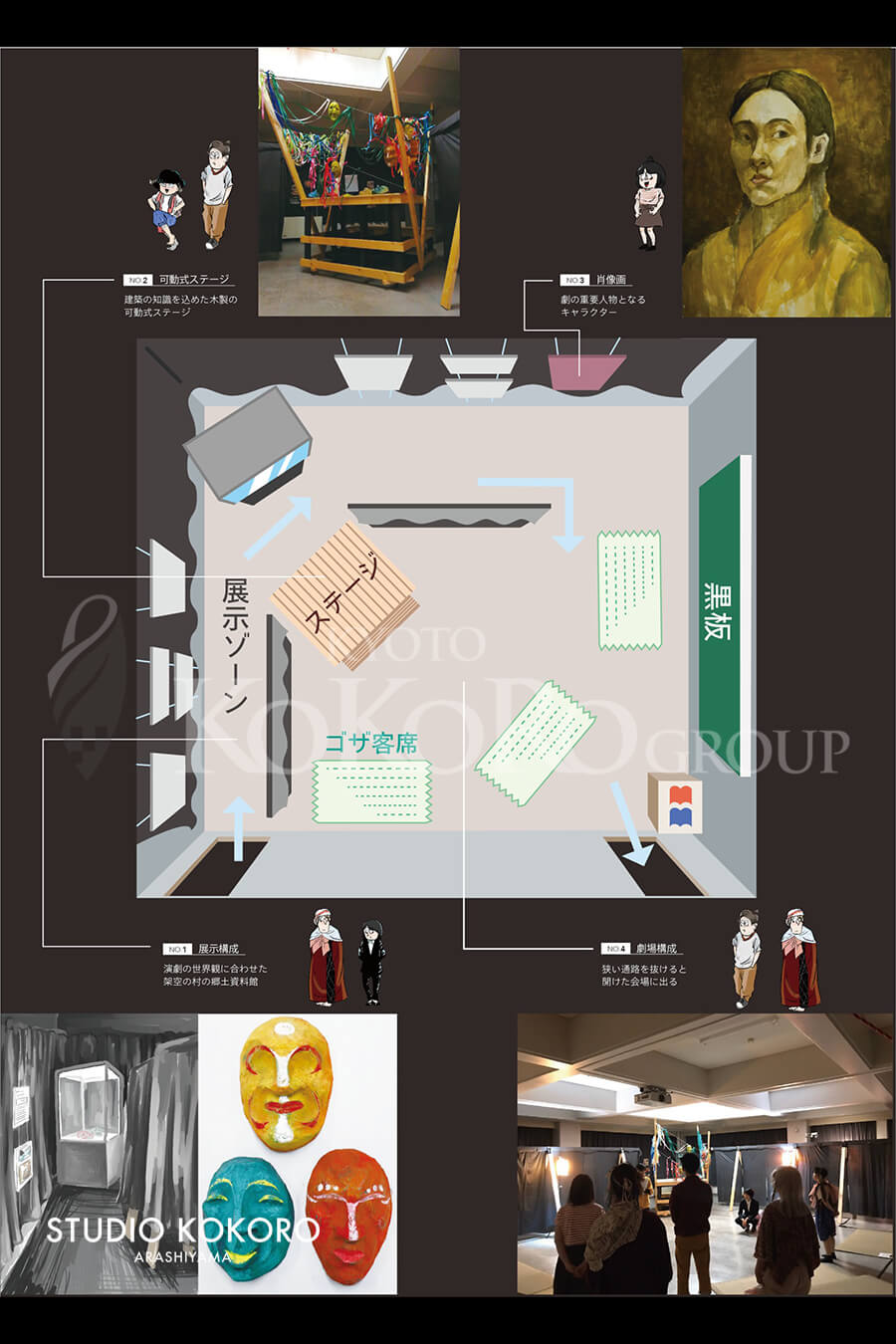 高い完成度の演劇を求めていく中で、「建築の学生にはその知識を活かした複雑な大道具、絵画を学んでいる生徒は小道具として肖像画を作るということを一番に決定し、それに合わせた脚本を構築するのが合理的なのでは」という仮説に至り、試験的に作ったものがこの舞台です。
