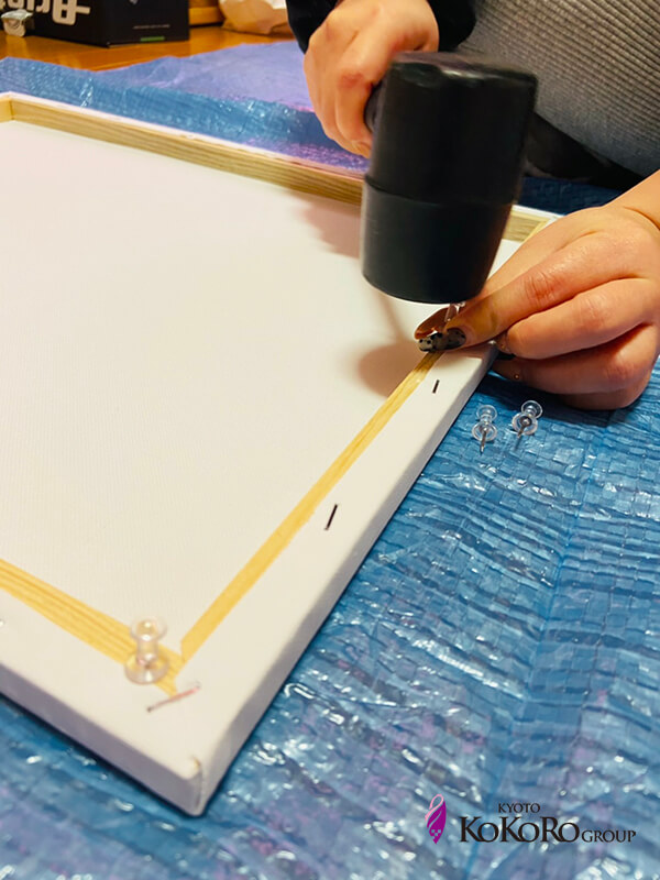 キャンバスの裏に、高さを出す為に押しピンを数ヶ所打っていきます。
