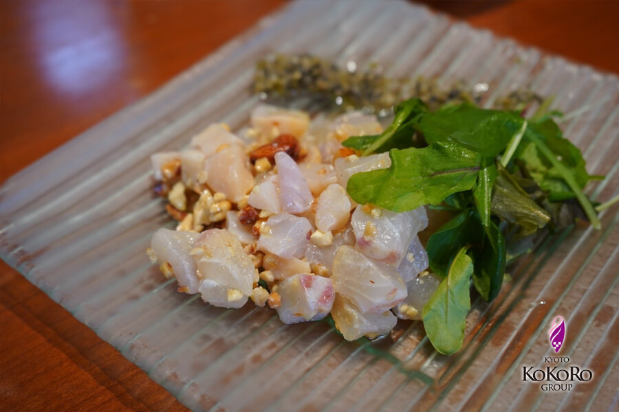 ~桜鯛と帆立のタルタル 軽い燻製 ソースタプナード~