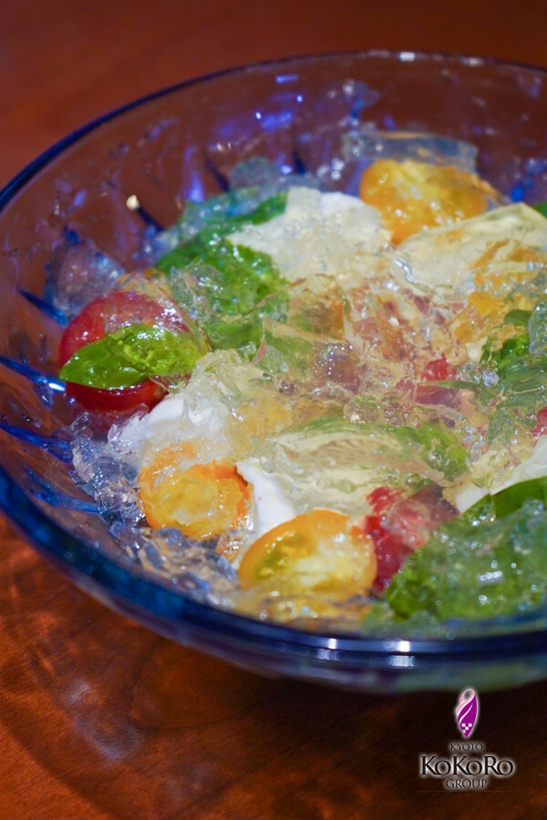 カプレーゼの上にかかっている物は、トマトのエキスだけを抽出してホワイトバルサミコ等で味付けし透明なゼリーにしています。