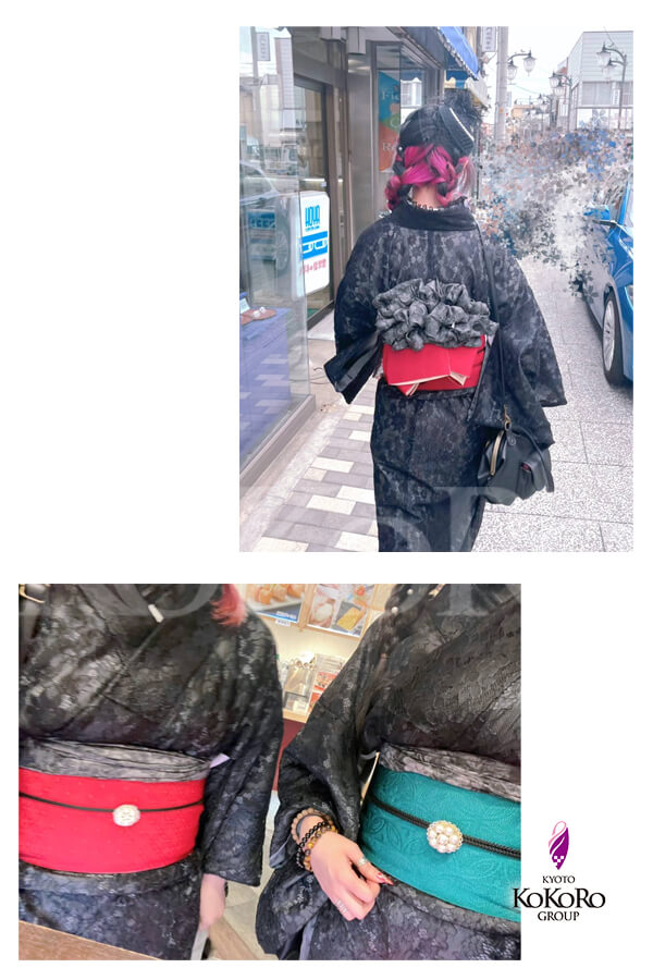 300着近くのお着物があるそうでとても迷いましたが、今回は黒いレース着物に赤い半幅帯を選びました♪