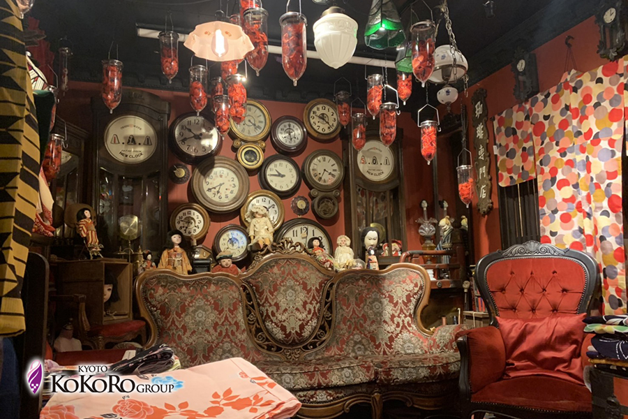 溢れんばかりのアンティーク時計や日本人形に囲まれて、レトロかつちょっぴりダークな雰囲気が漂う空間でした。