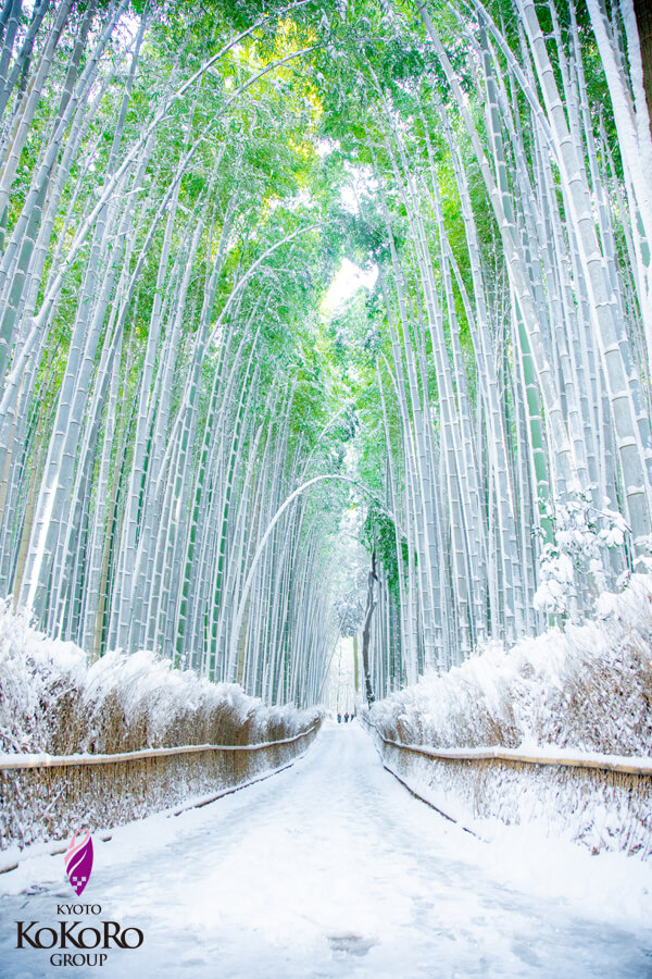 京都を代表する観光スポットの竹林に雪が掛かると、より一層美しさが増します。