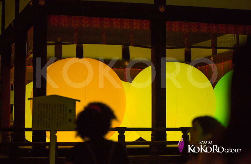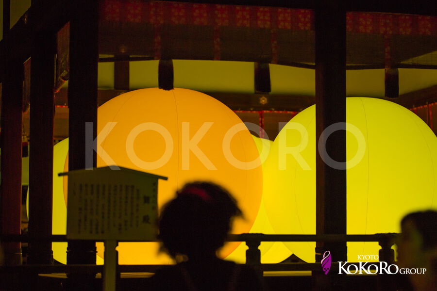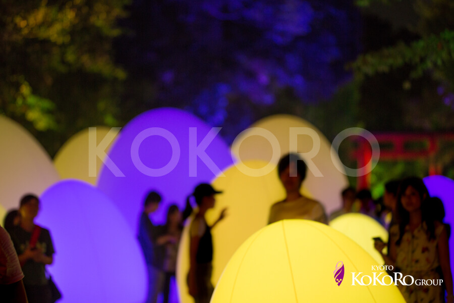 数秒ごとにさまざまな色に変化するタマゴ型の光と、ライトアップされた真っ赤な鳥居の荘厳な雰囲気…