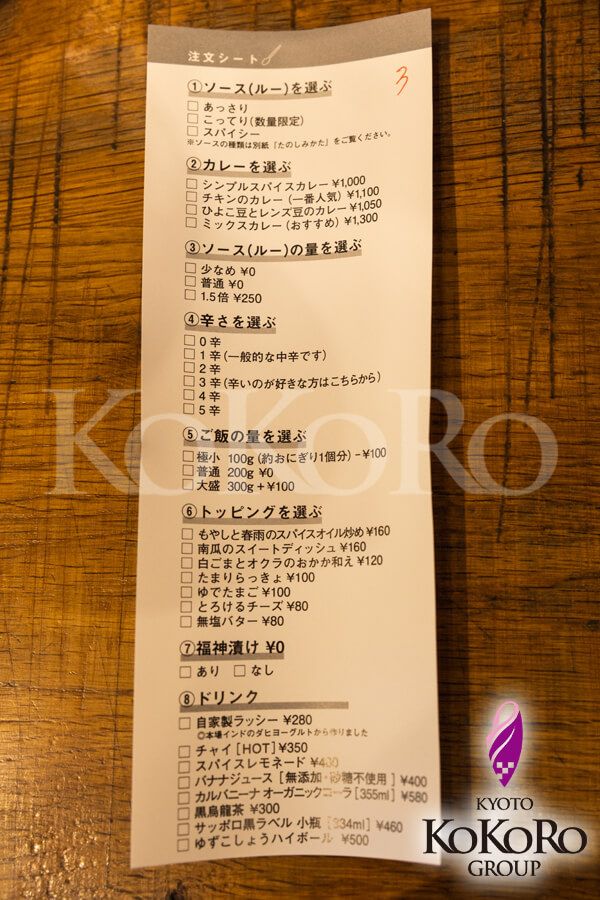「TOKYO SPICE ななCURRY」さんでは各席に注文シートが置いてあるので、その注文シートに書いて注文するスタイルです(´∀`∩