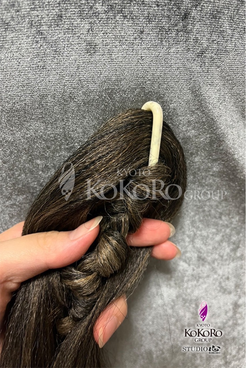 まずお好きなリングに毛束を通し、その一部の毛束で細めの三つ編みを作ります。