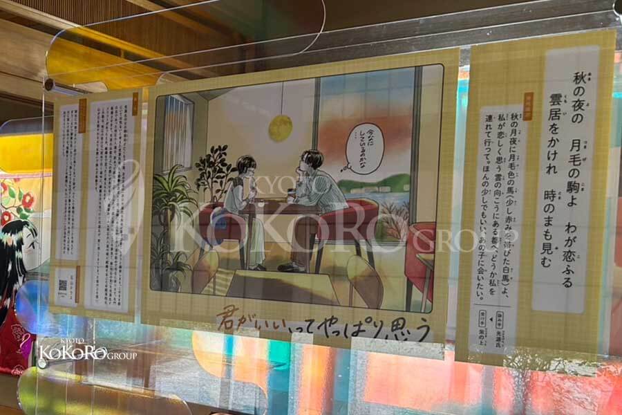 テーマは「もしこの物語が現代のお話だったら」ということで、源氏物語の登場人物の読んだ和歌の現代語訳がイラスト化されていました。