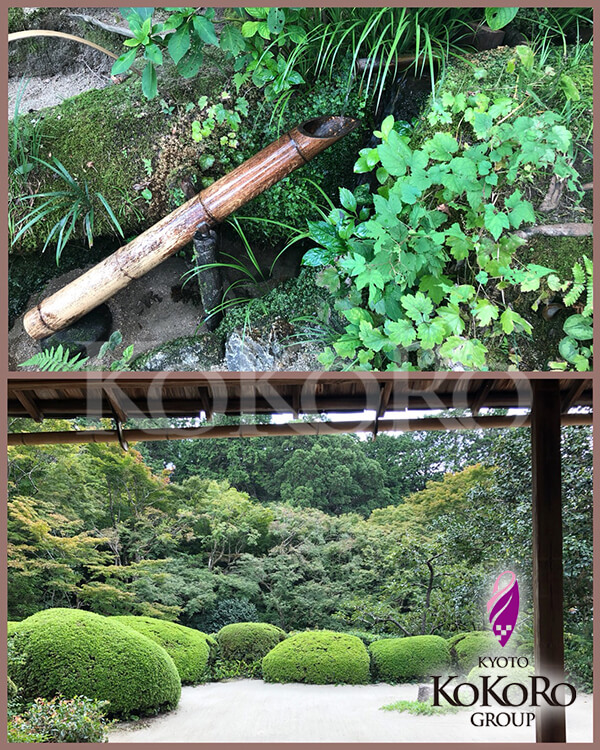 大きな畳のお部屋「書院」の目の前には大きな庭が広がっており、静かな中に、ししおどしの「かこーん」と音が響き、時間を忘れて居られるような感じでした。