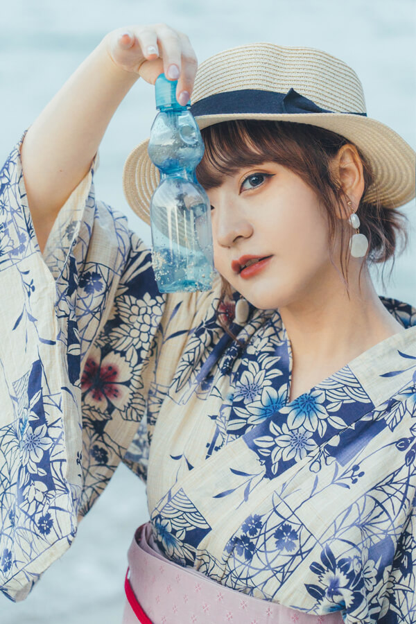 ブルーの着物に爽やかなサイダー・・・(*´▽`*)