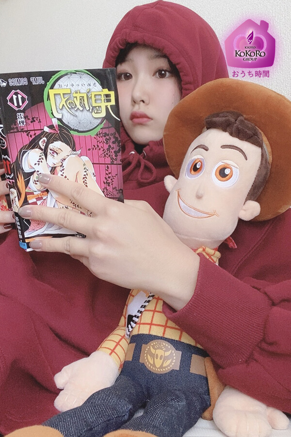 【私のおうち時間は、富田のお姉さんに借りた鬼滅の刃をひたすらに見ては寝て、見ては寝ての繰り返しですヽ(*′ー`)ノ フゥッ♪ (友達のウッディと)小さくなった禰豆子ちゃんがかわいい♡マッタリした時間に癒されています♪♪】