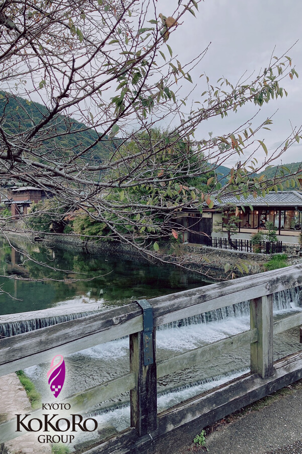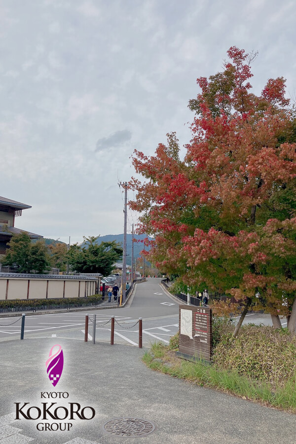 ほんのり紅葉しつつある木々を横目に、正面には宿泊施設 京都嵐山温泉【花伝抄】さんがございます。