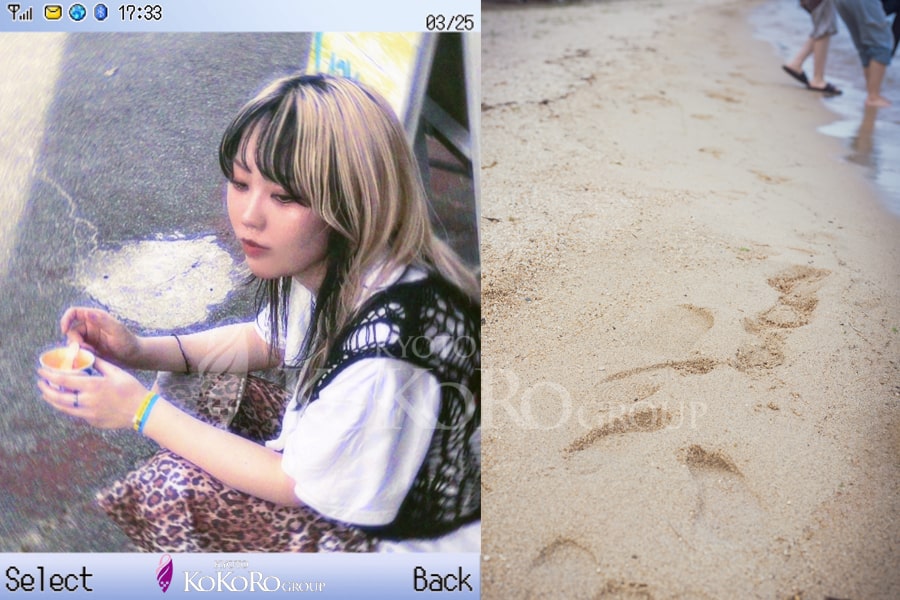 砂浜に残る足跡…と「アンニュイの中心でアイスを食べる」山下さんです。夏っぽくてエモいセットの写真ですね✨