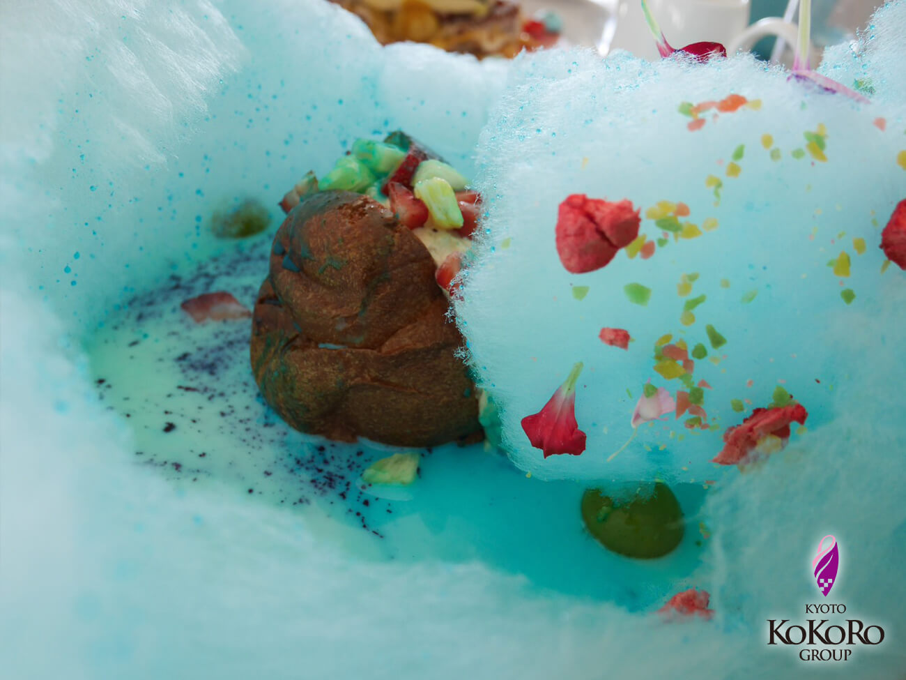 ミルクのような液体を綿あめにかけていきます。