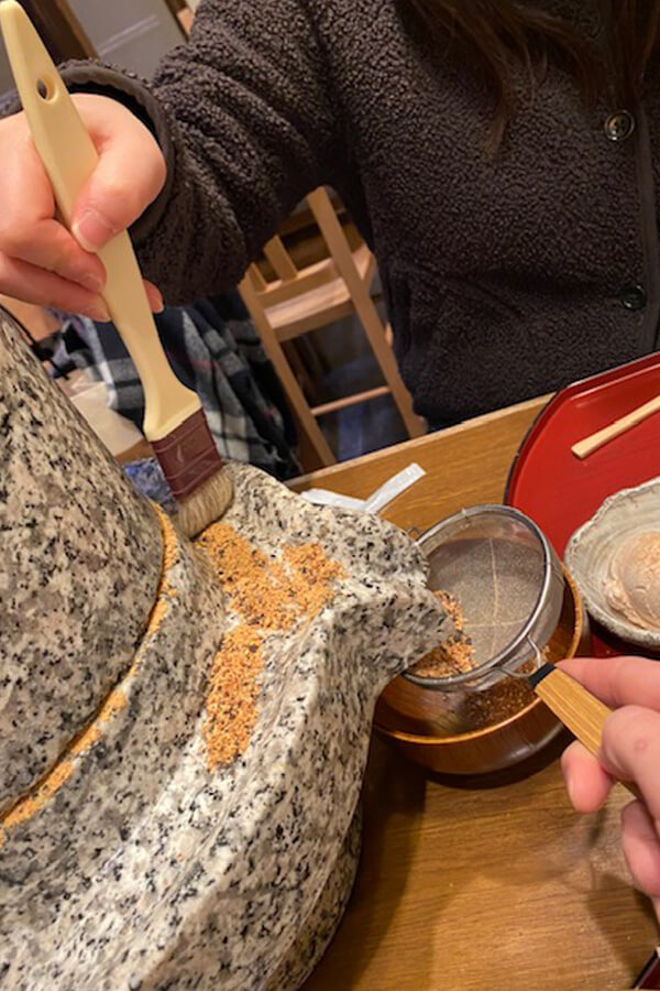 「こちらのお店では黒豆を使ったランチや甘味を頂くことができるのですが、おすすめのポイントは自分で石臼を使って黒豆を挽き、その場できな粉を作って食べることができるのです!