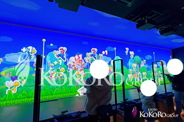 巨大なスクリーンに映るマリオの世界で、ザッパーやスーパースコープを使って射撃体験ができます。最大13人まで同時にプレイすることができます。