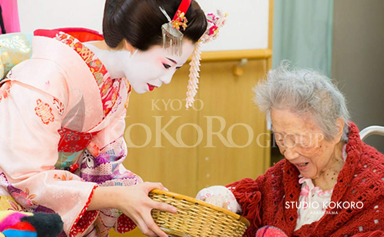 当グループでは、近隣の老人ホームやデイサービスの職員さんを無償で舞妓さんに変身させて頂き、施設内を巡る活動を行っています。